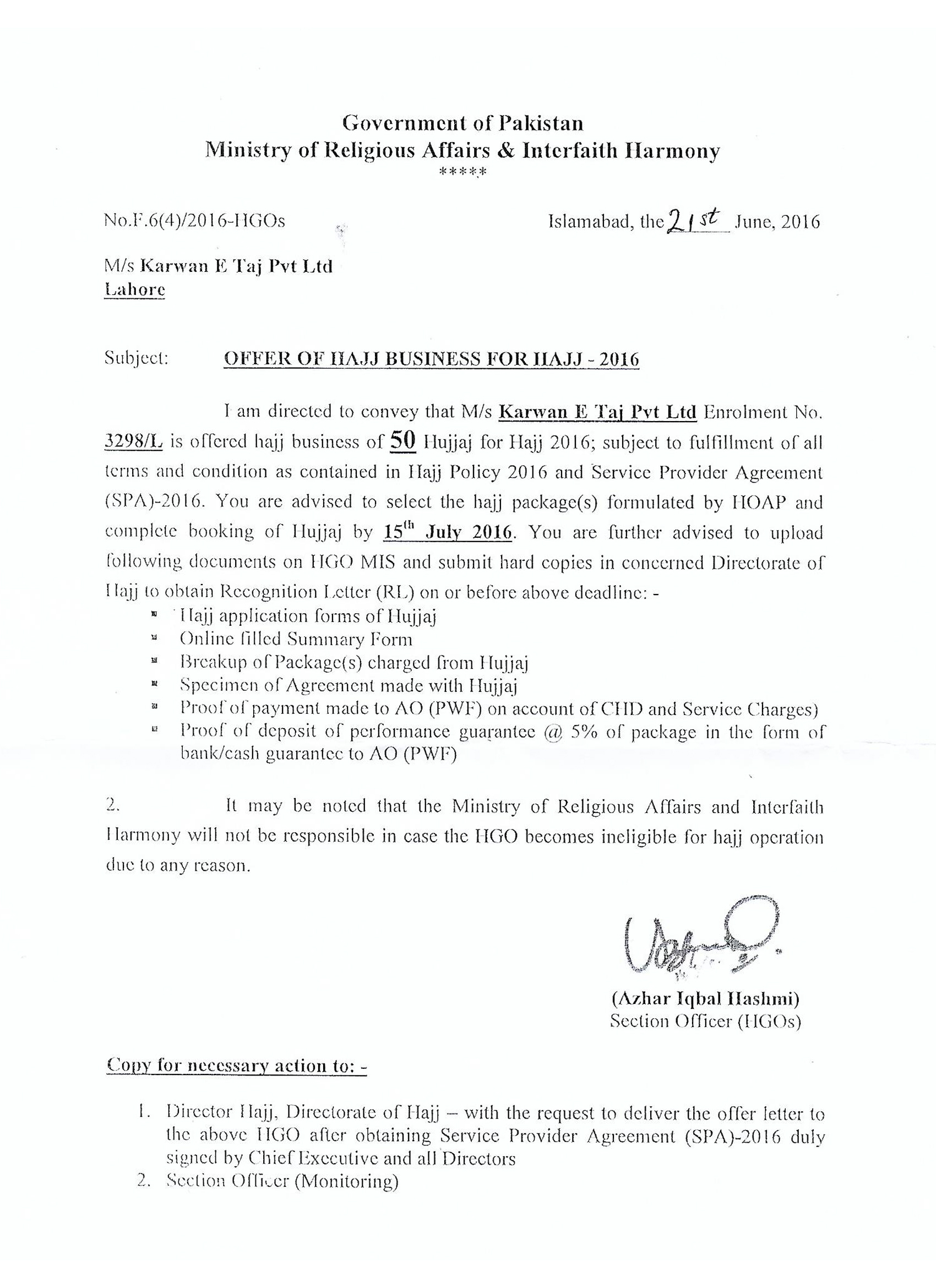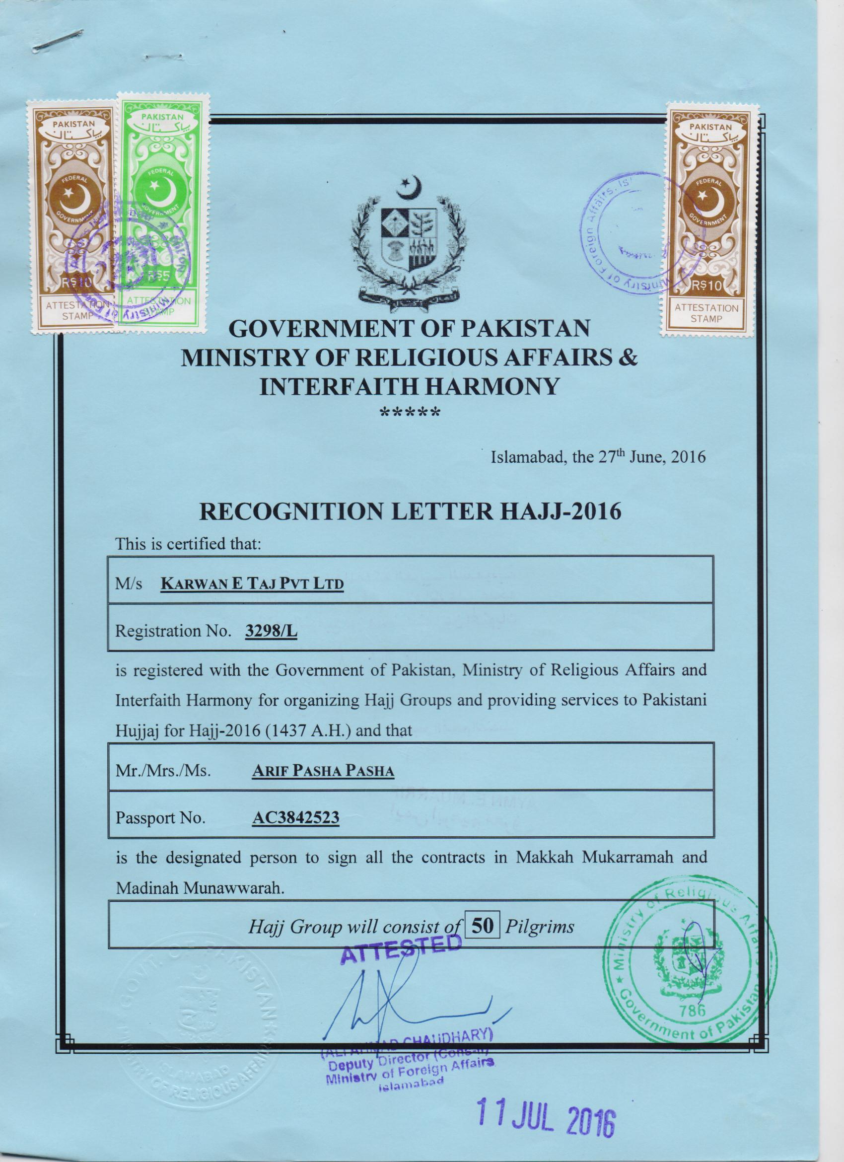 Recognition Letter by Government of Pakistan